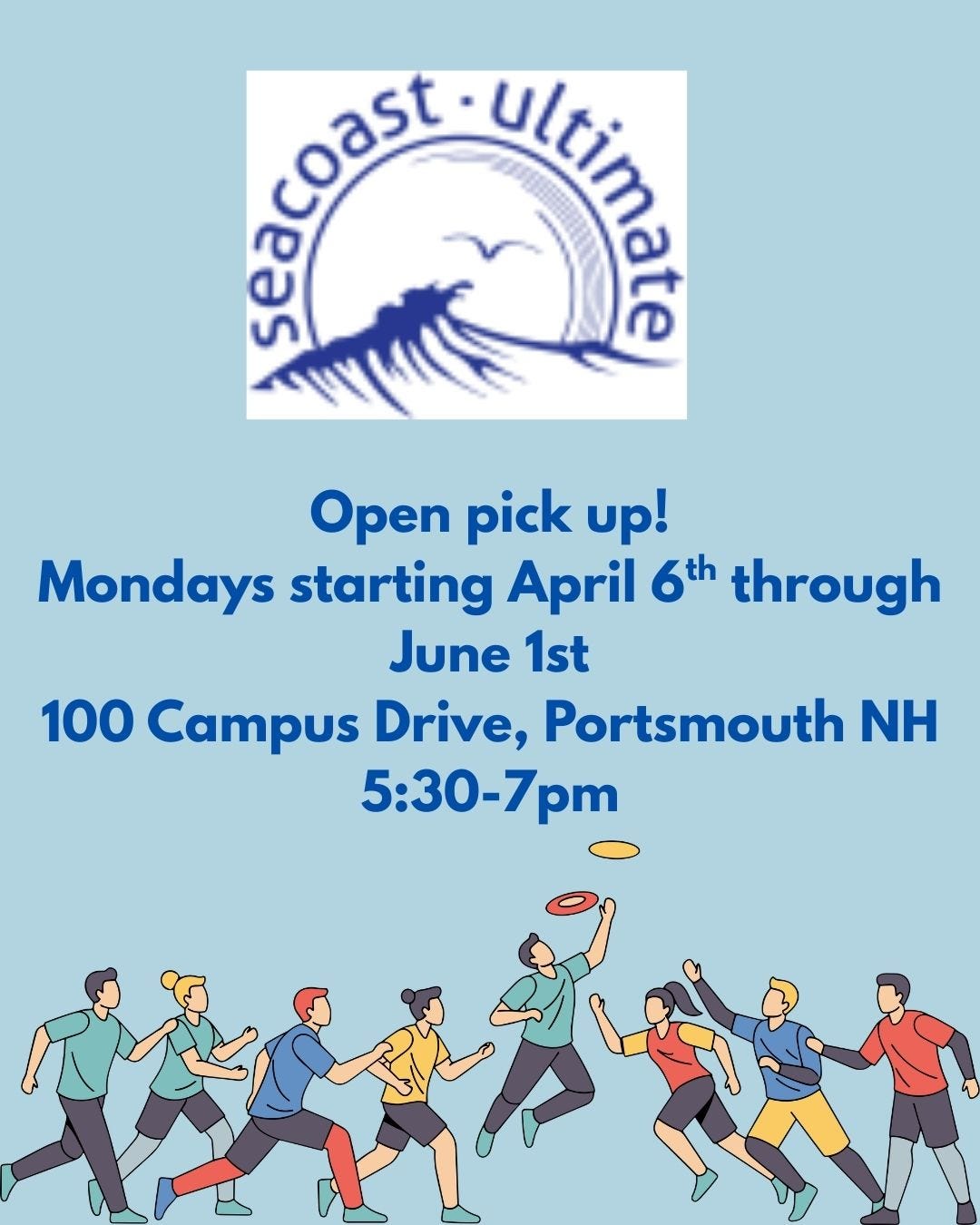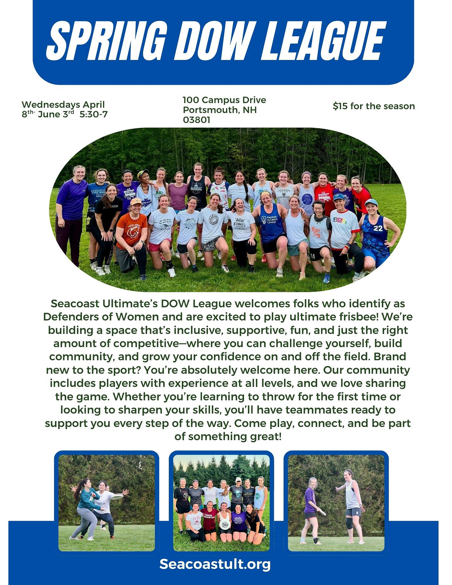 Registration is open for the 2026 Spring DOW League! This league will run from Wednesday, April 8th (that’s this week!) until Wednesday, June 3rd from 5:30 to 7 pm on the grass fields at Portsmouth Community Campus (100 Campus Drive, behind the pickle ball courts). The cost to play is $15 for the entire session.